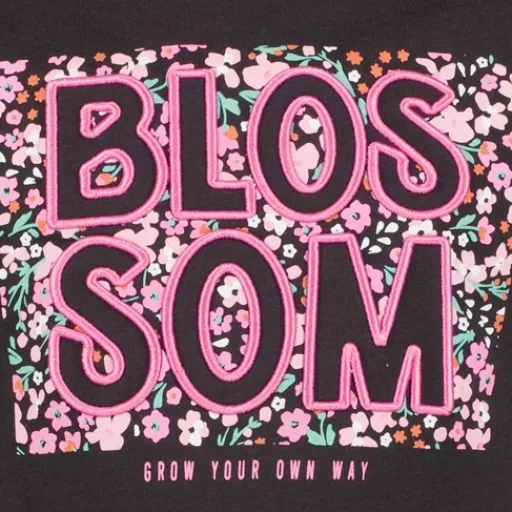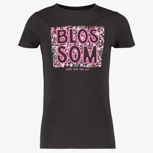 Zwart T-shirt voor meisjes van TwoDay. Voorzien van korte mouwen, een ronde hals en een tekstopdruk met bloemetjes aan de voorzijde. Het shirt is gemaakt van 100% katoen.