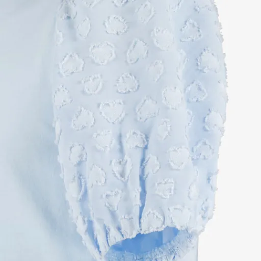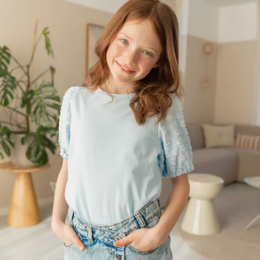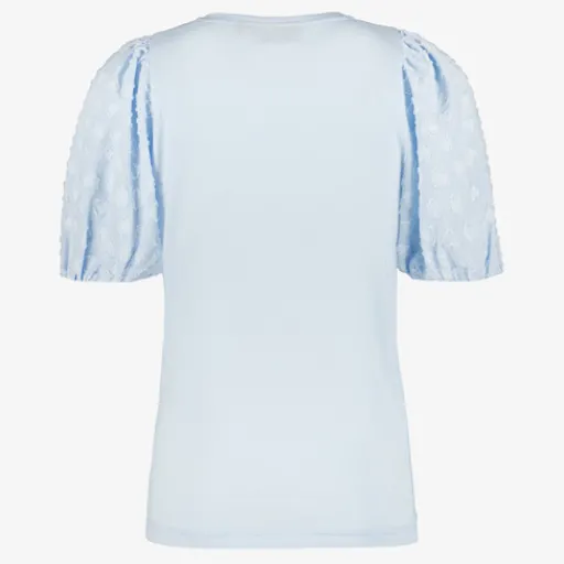 Lichtblauw T-shirt voor meisjes van TwoDay. Voorzien van een ronde hals en pofmouwen met hartjes. Het shirt is gemaakt van 50% katoen en 50% polyester.