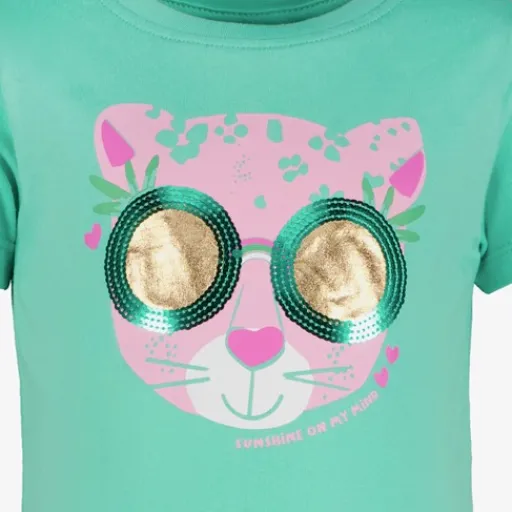 Blauw-groen meisjes T-shirt van TwoDay. Voorzien van een opdruk van een panter met een zonnebril en glitters. Gemaakt van 100% katoen.