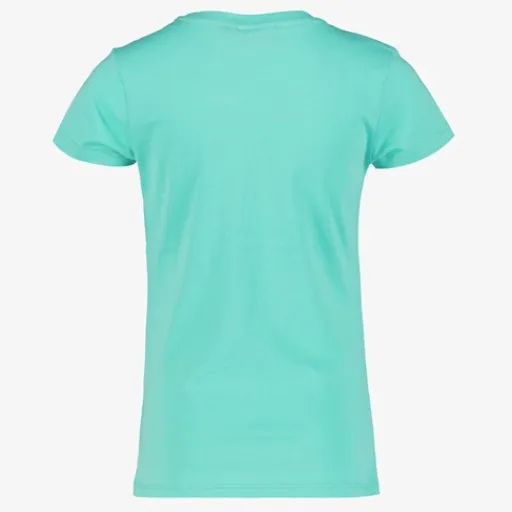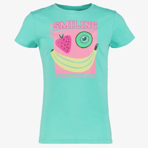 Blauw T-shirt voor meisjes van TwoDay. Voorzien van korte mouwen, een ronde hals en een tekstopdruk met fruit aan de voorzijde. Het shirt is gemaakt van 100% katoen.