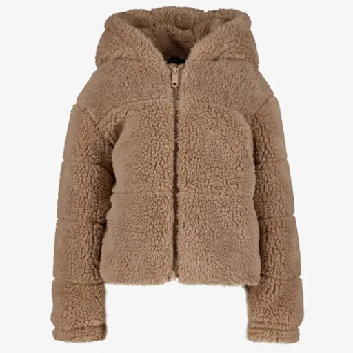 Lichtbruine teddy jas voor meisjes. Voorzien van een ritssluiting, grote capuchon en twee steekzakken. De teddy jas is gemaakt van 100% polyester.