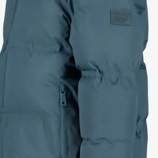 Blauwe, gewatteerde winterjas voor jongens. Voorzien van een ritssluiting met kinbeschermer en een vaste capuchon. De jas heeft twee zakken met ritsen en is gemaakt van 100% polyester.
