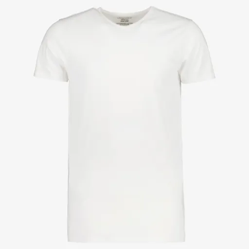 Wit T-shirt van Unsigned voor heren. Dit comfortabele heren T-shirt is voorzien van een subtiele v-hals en korte mouwen. Het shirt is extra lang (+6 cm). Gemaakt van 95% organisch katoen en 5% elastaan.