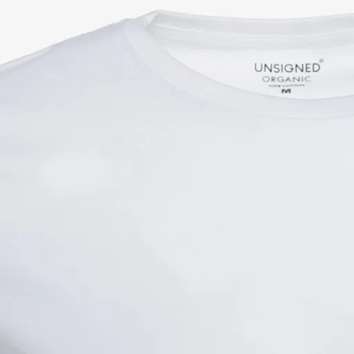 Wit basic T-shirt voor heren uit de Unsigned collectie. Voorzien van korte mouwen en een hoge, ronde hals. Het T-shirt heeft een comfortabele, slimfit pasvorm. Dit artikel is gemaakt van 100% biologisch katoen.