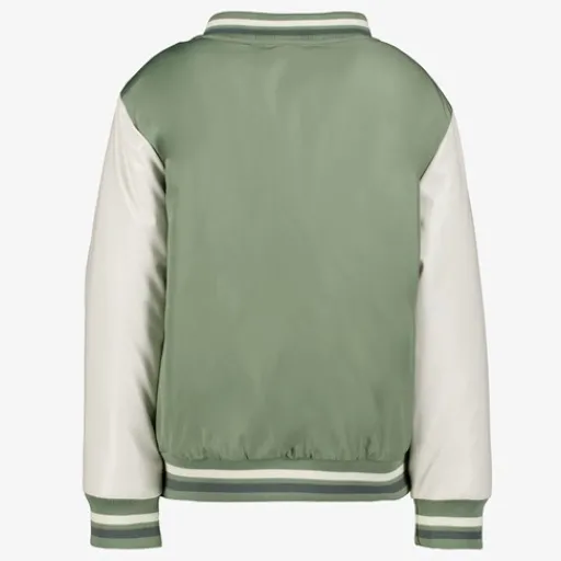 Sportief bomberjack voor jongens van Unsigned. Voorzien van knoopsluitingen, elastische boorden en twee steekzakken. Het groene bomberjack heeft witte mouwen en een opdruk op de borst. Gemaakt van 100% polyester.