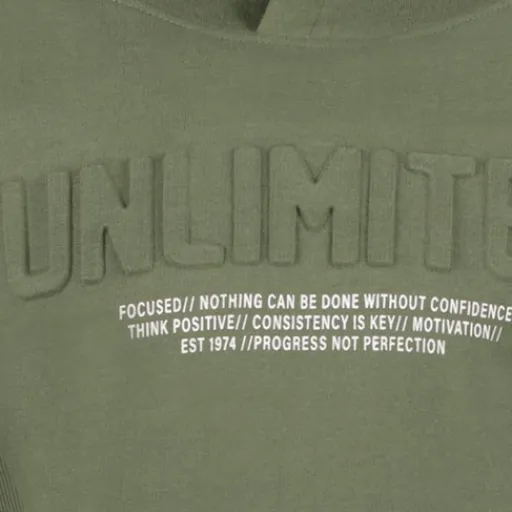Kaki groene hoodie voor jongens van Unsigned. Voorzien van een capuchon, lange mouwen en een tekstopdruk op de borst. De hoodie is heerlijk comfortabel en warm voor tijdens de koudere dagen! Gemaakt van 100% katoen.