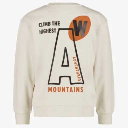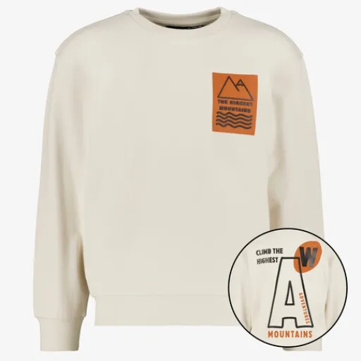 Beige sweater met backprint voor jongens van Unsigned. Voorzien van een hoge, ronde hals en lange mouwen met elastische boorden. De sweaters heeft een oranje opdruk op de borst en is gemaakt van 100% katoen.