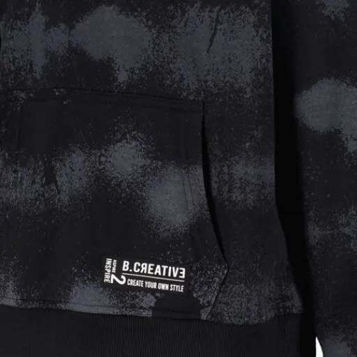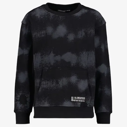 Zwarte jongens sweater van Unsigned. Voorzien van een ronde hals en lange mouwen. Deze gave sweater heeft buidelzak aan de voorzijde en een grijze tie-dye dessin. Gemaakt van 100% polyester.