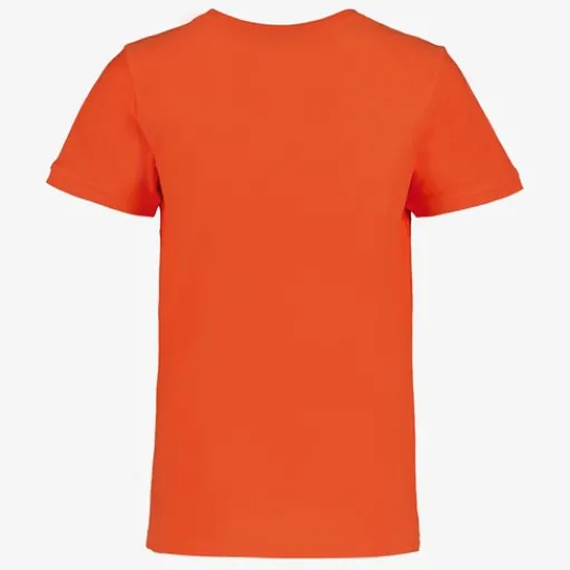 Oranje T-shirt voor jongens. Voorzien van korte mouwen, een ronde half en tekstopdruk aan de voorzijde. Gemaakt van 100% katoen.