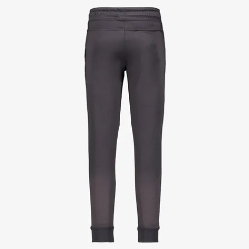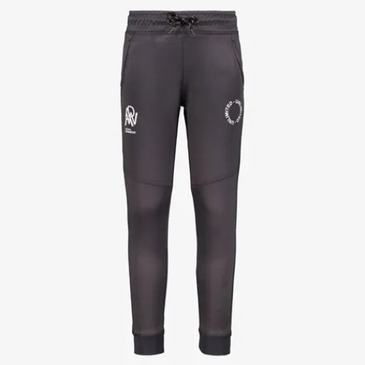 Grijze joggingbroek voor jongens van Unsigned. Voorzien van een elastische tailleband met aantrekkoordjes, twee steekzakken met rits aan de voorzijde en elastische boorden bij de broekspijpen. De broek heeft witte opdrukken op de bovenbenen en is gemaakt van 100% polyester.